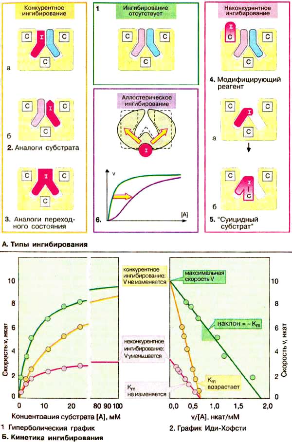 Большинство ингибиторов ферментов действуют обратимо, т. е. не вносят в молекулу фермента каких-либо изменений после своей диссоциации. Однако существуют также необратимые ингибиторы ферментов, которые необратимо модифицируют целевой фермент. Принцип действия ингибитора, тип его ингибирования определяют путем сравнения кинетики реакции в присутствии ингибиторам без него. Различают конкурентное (А, слева) и неконкурентное (А, справа) ингибирование. В регуляции обмена веществ важную роль играет аллостерическое ингибирование (А, 6).