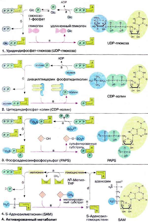 АТФ и другие нуклеозидтрифосфатные коферменты могут переносить не только фосфатные остатки, но и участвовать также в реакциях активации. Здесь рассмотрены метаболиты или группы, которые активируются при обмене веществ, связанном с нуклеозидами или нуклеотидами. В дальнейшем такая активация будет продемонстрирована на примере метаболизма сложных углеводов и липидов.