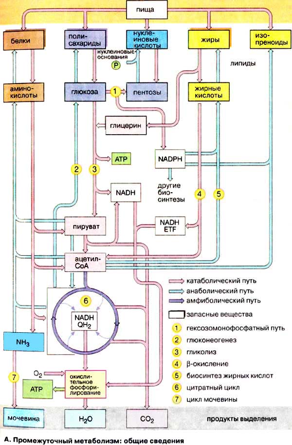 Гетеротрофы, например животные и грибы, зависят от получения органических веществ с пищей. Так как большая часть этих питательных веществ (белки, углеводы, нуклеиновые кислоты и липиды) не могут утилизироваться непосредственно, они сначала разрушаются до более мелких фрагментов катаболическим путем (на схеме красные стрелки). Возникающие метаболиты (в совокупности их называют иногда «пулом метаболитов») затем катаболизируются с высвобождением свободной энергии или используются в анаболических путях (голубые стрелки) для синтеза более сложных молекул. Из многочисленных метаболитов здесь представлены только три наиболее важных представителя - пируват, ацетил-КоА и глицерин. Эти три соединения являются связующим звеном между метаболизмом белков, углеводов и липидов. К метаболическому пулу принадлежат также промежуточные метаболиты цитратного цикла (6). Этот циклический путь играет как катаболическую, гак и анаболическую роль, т. е. является амфиболическим. Конечными продуктами разрушения органических веществ у животных являются диоксид углерода (CO2), вода (H2O) и аммиак (NH3). Аммиак превращается в мочевину и в такой форме выводится из организма.