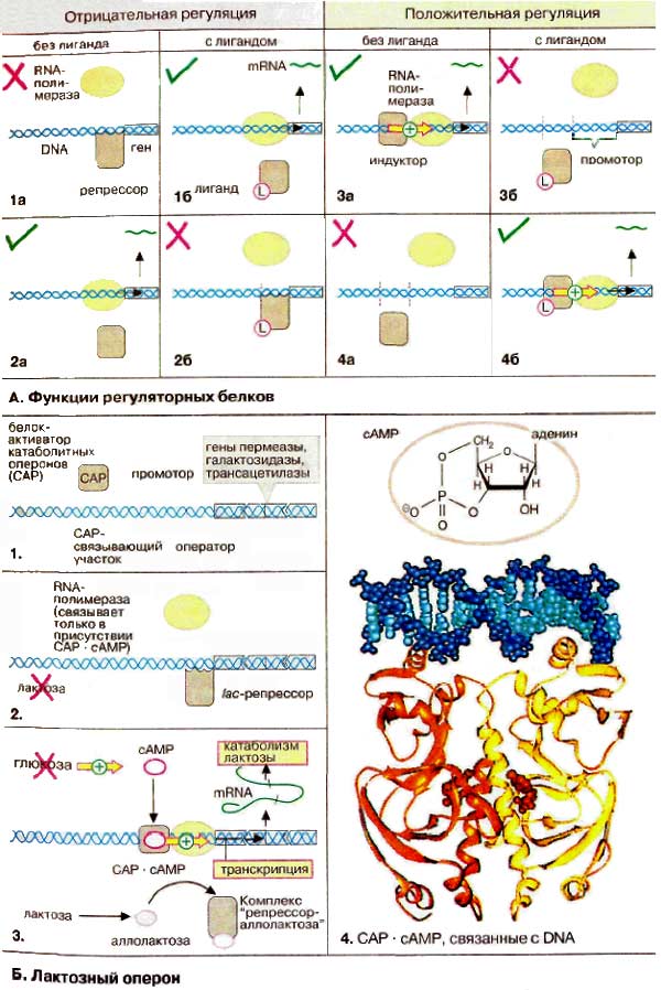 Многочисленные известные регуляторные белки можно разделить по механизму действия на четыре группы. Негативная генетическая регуляция, т. е. выключение соответствующих генов, может вызываться репрессорами. Некоторые репрессоры связываются с ДНК только в отсутствие специфического лиганда (1а). Комплекс репрессора с лигандом в этом случае теряет способность к связыванию и оставляет свободным участок промотора для присоединения РНК-полимеразы (1б). Часто свободный от лиганда репрессор не может связываться с ДНК, т. е. транскрипция подавляется только в присутствии лигандов (2а, 2б). Аналогично при позитивной генетической регуляции можно различать два случая. Если связывается только свободный индуктор, транскрипция подавляется соответствующими лигандами (3). Напротив, многие индукторы становятся активными только после образования комплекса с лигандом (4). К этой группе принадлежат, например, стероидные гормоны.