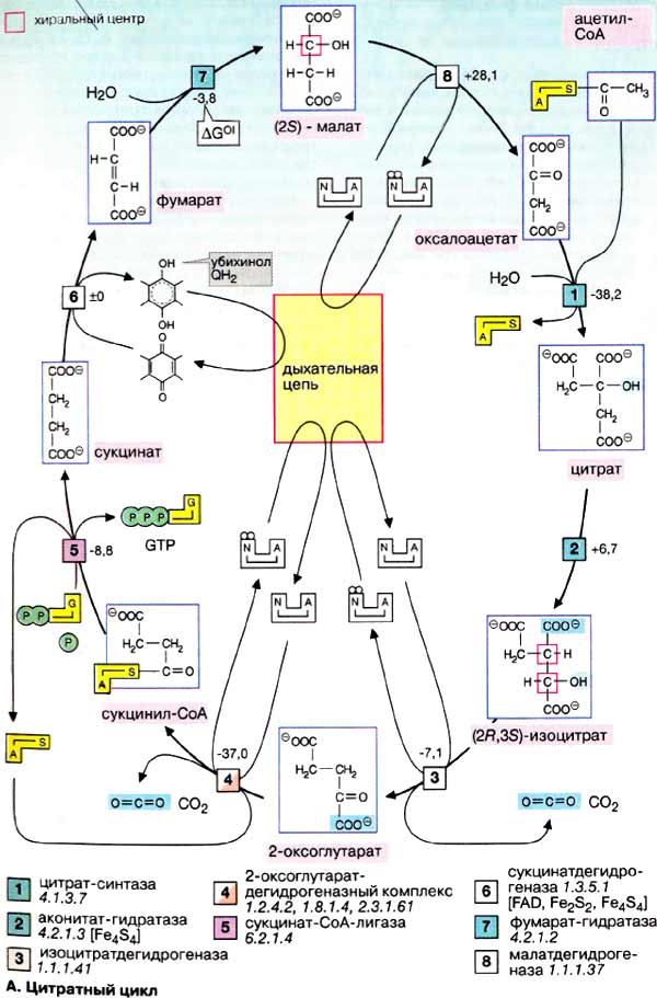 На следующей стадии изоцитратдегидрогеназа (3) окисляет гидроксигруппу изоцитрата в оксогруппу с одновременным отщеплением одной из карбоксильных групп в виде CO2 и образованием 2-оксоглутарата. Последующее образование сукцинил-КоА [4], включающее реакции окисления и декарбоксилирования, катализируется мультиферментным комплексом, 2-оксоглутаратдегидрогеназой (дегидрогеназы кетокислот рассмотрены на предыдущей странице). Расщепление тиолсложноэфирной связи сукцинил-КоА с образованием сукцината и кофермента А, катализируемое сукцинат-КоА-лигазой («тиокиназой» (5)], — высокоэкзоэргическая реакция, энергия которой используется для синтеза фосфоангидридной связи («субстратного фосфорилирования», см. с. 126). В цитратном цикле синтезируется не АТФ, как в большинстве таких реакций, а гуанозинтрифосфат [ГТФ (GTP)], который легко превращается в АТФ нуклеозиддифосфаткиназой (на схеме не показано).