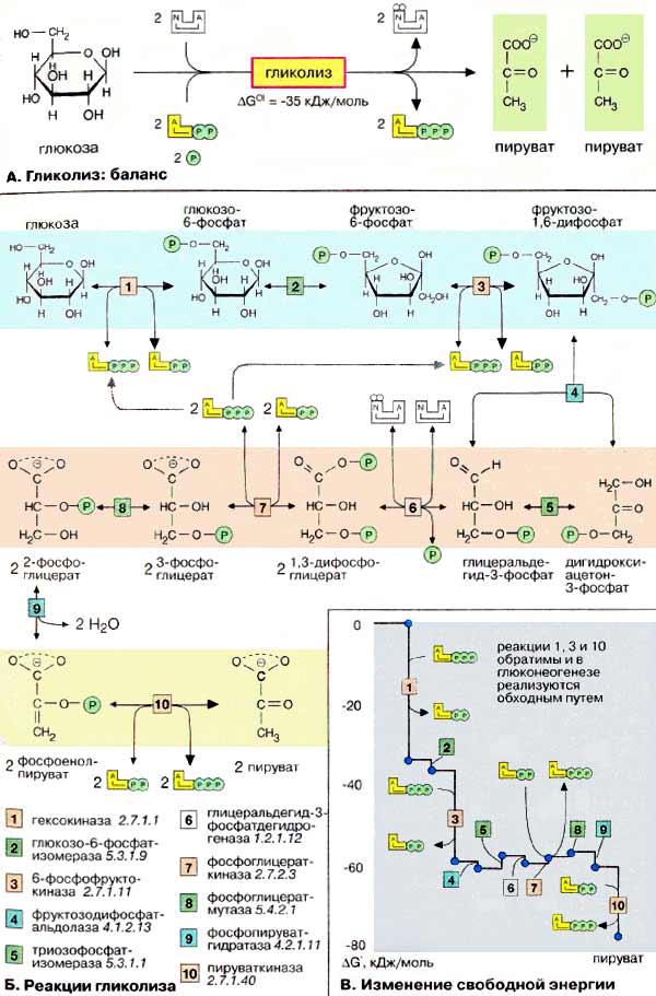 Видно, что только три реакции (1, 3 и 10) протекают с высоким изменением свободной энергии, причем равновесие сильно смещено в сторону образования конечных продуктов. Другие реакции легко обратимы. Они могут идти в противоположном направлении при биосинтезе глюкозы (глюконеогенезе), причем с участием тех же ферментов, что и при деградации глюкозы. Для необратимых стадий 1, 3 и 10 в глюконеогенезе используются обходные пути.