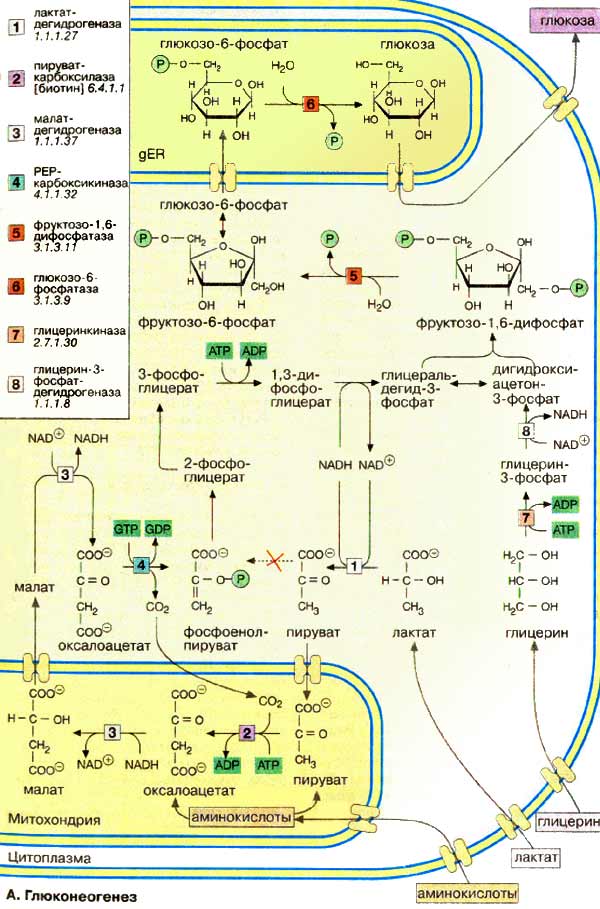 Многие реакции глюконеогенеза катализируются теми же ферментами, что и процессы гликолиза. Некоторые ферменты специфичны для глюконеогенеза и синтезируются только по мере необходимости под воздействием кортизола и гпюкагона. На схеме представлена только эта группа ферментов. В то время как гликолиз протекает в цитоплазме, глюконеогенез происходит также в митохондриях и эндоплазматическом ретикулуме.