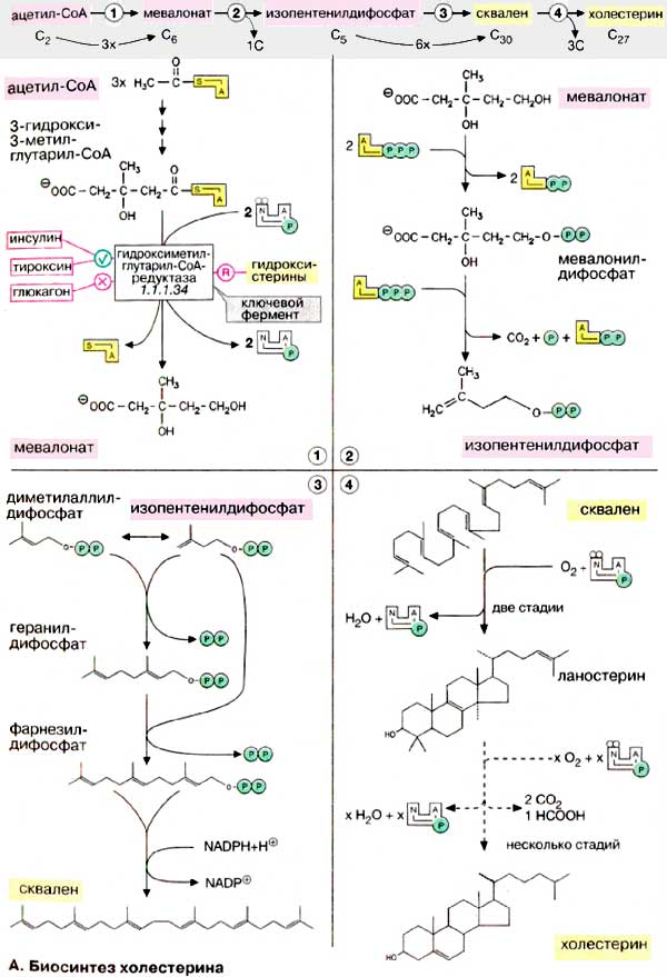 Биосинтез холестерина, кап и всех изопреноидов, начинается с ацетил-КоА. Углеродный скелет С27-стерина строится из С2-звеньев в длинной и сложной последовательности реакций. Биосинтез холестерина можно разделить на четыре этапа. На первом этапе (1) из трех молекул ацетил-КоА образуется мевалонат (С6). На втором этапе (2) мевалонат превращается в «активный изопрен», изопентенилдифосфат. На третьем этапе (3) шесть молекул изопрена полимеризуются с образованием сквалена (С30). Наконец, сквален циклизуется с отщеплением трех атомов углерода и превращается в холестерин (4). На схеме представлены только наиболее важные промежуточные продукты биосинтеза.
