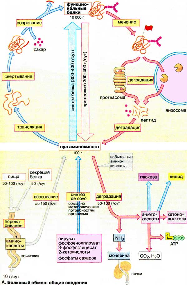 Предполагается, что в организме взрослого человека ежедневно разрушается до аминокислот 300-400 г белка (протеолиз) В тоже время примерно то же самое количество аминокислот включается во вновь образованные молекулы белков (белковый биосинтез). Высокий оборот белка в организме необходим потому, что многие белки относительно недолговечны: они начинают обновляться спустя несколько часов после синтеза, а биохимический полупериод составляет 2-8 дней. Еще более короткоживущими оказываются ключевые ферменты промежуточного обмена. Они обновляются спустя несколько часов после синтеза. Это постоянное разрушение и ресинтез позволяют клеткам быстро приводить в соответствие с метаболическими потребностями уровень и активность наиболее важных ферментов. В противоположность этому особенно долговечны структурные белки, гистоны, гемоглобин или компоненты цитоскелета.
