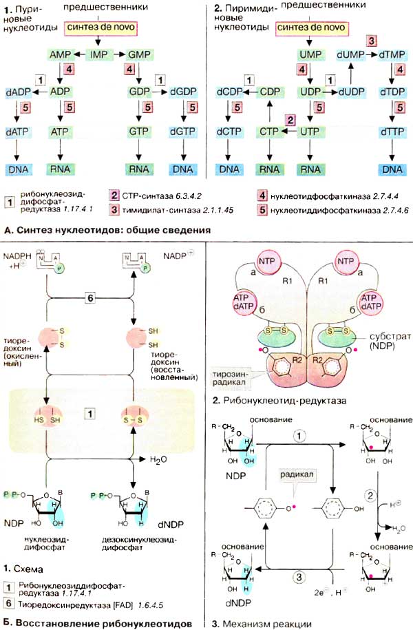Синтез пуриновых нуклеотидов (1) осуществляется из инозинмонофосфата [ИМФ (IMP)]. Его основание гипоксантин превращается в две стадии соответственно в аденин или гуанин. Образующиеся нуклеозидмонофосфаты АМФ (AMP) и ГМФ (GMP) переходят в дифосфаты АДФ (ADP) и ГДФ (GDP) под действием нуклеозидфосфаткиназ и, наконец, фосфорилируются нуклеозиддифосфаткиназами до трифосфатов АТФ (АТР) и ГТФ (GTP). Нуклеозидтрифосфаты служат строительными блоками для РНК (RNA) или функционируют в качестве коферментов. Преобразование рибонуклеотидов в дезоксирибонуклеотиды происходит на стации дифосфатов и катализируется нуклеозиддифосфат-редуктазой (схема Б).