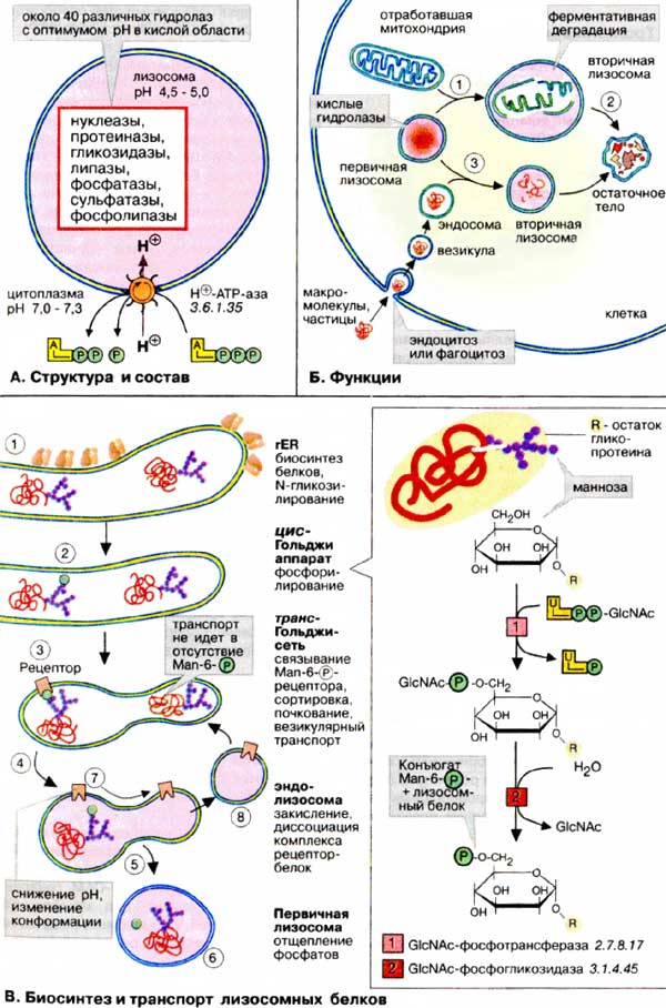 Лизосомы — это органеллы диаметром 0,2-2,0 мкм, окруженные простой мембраной, способные принимать самые разные формы. Обычно на клетку приходится несколько сотен лизосом. Функция лизосом заключается в деградации клеточных компонентов. Деградация достигается за счет присутствия в лизосомах около 40 типов различных расщепляющих ферментов — гидролаз с оптимумом действия в кислой области. Главный фермент лизосом — кислая фосфатаза. В мембране лизосом находятся АТФ-зависимые протонные насосы вакуольного типа. Они обогащают лизосомы протонами, вследствие чего для внутренней среды лизосом рН 4,5-5,0 (в то время как в цитоплазме рН 7,0-7,3). Лизосомные ферменты имеют оптимум рН около 5,0, т. е. в кислой области. При рН, близких к нейтральным, характерным для цитоплазмы, эти ферменты обладают низкой активностью. Очевидно, это служит механизмом защиты клеток от самопереваривания о том случае, если лизосомный фермент случайно попадет в цитоплазму.