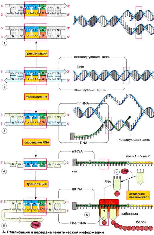 Транскрипция. Для экспрессии гена, т.е. синтеза закодированных в нем белков, последовательность нуклеотидов кодирующей цепи ДНК должна быть трансформирована в аминокислотную последовательность. Поскольку ДНК не принимает непосредственного участия в синтезе белка, информация, хранящаяся в ядре, должна быть перенесена на рибосомы, где собственно и осуществляется биосинтез белков. Для этого соответствующий участок кодирующей цепи ДНК считывается (транскрибируется) с образованием гетерогенной ядерной РНК [гяРНК (hnRNA)], т. е. последовательность этой РНК комплементарна кодирующей цепи ДНК (3; см. с. 90). Поскольку в РНК вместо тимина содержится урацил (см с. 86), AAG триплет ДНК трансформируется в UUC-кодон гяРНК.