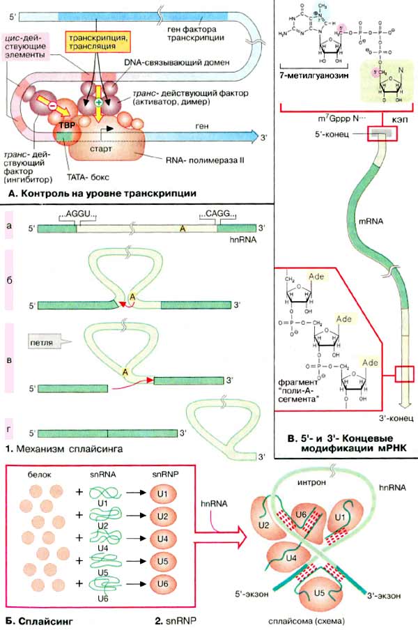 Порядок транскрибирования генов определяется регуляторной системой, которая носит название системы регуляции транскрипции. Контроль транскрипции осуществляется структурами двух типов. Большинство генов содержат в своем промоторном участке несколько коротких сегментов ДНК (DNA) (регуляторные элементы, цис-действующие элементы), с которыми могут связываться факторы транскрипции. Регуляторные элементы, стимулирующие транскрипцию связанных с ними генов, называются энхансерами (усилителями, от англ. enhancer). Белки, подавляющие транскрипцию. — сайленсерами (успокоителями, от англ. silencer). Факторы транскрипции — это белки, т. е. продукты других, независимых генов. Поэтому их называют опосредованно действующими факторами. Для процесса транскрипции генов требуются не только РНК-полимераза, но и другие белки, называемые основными факторами транскрипции. Установлено, что у эукариот таким фактором является ТАТА-связывающий белок (ТСБ, англ. ТАТА-Вох Binding Protein, TBP), который взаимодействует с основным регуляторным элементом. ТАТА-боксом, присутствующим в большинстве генов. С этим комплексом затем связываются другие основные факторы транскрипции и РНК-полимеразы. Дополнительные факторы могут влиять на инициацию транскрипции, связываясь с другими регуляторными элементами. Отсюда они взаимодействуют с основным транскрипционным комплексом, либо активируя, либо ингибируя его. Такие факторы активируют, например, комплексы стероидных гормонов с рецепторами. По завершении транскрипции из гяРНК вырезаются интроны, содержащие некодирующие последовательности.