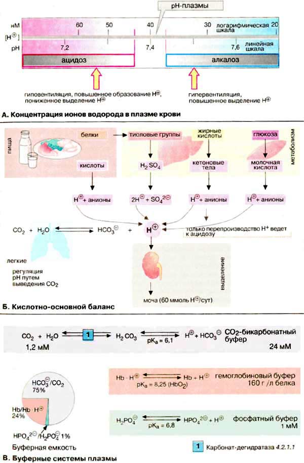 Постоянство величины рН поддерживается буферными системами плазмы (схема В), которые могут компенсировать кратковременные нарушения кислотно-основного баланса. Длительное рН-равновесие поддерживается с помощью продукции и удаления протонов. При нарушениях в буферных системах и при несоблюдении кислотно-основного баланса, например в результате заболевания почек или сбоев в периодичности дыхания из-за гипо- или гипервентиляции, величина рН плазмы выходит за допустимые пределы. Уменьшение величины рН 7,40 более, чем на 0,03 единицы, называется ацидозом, а повышение — алкалозом
