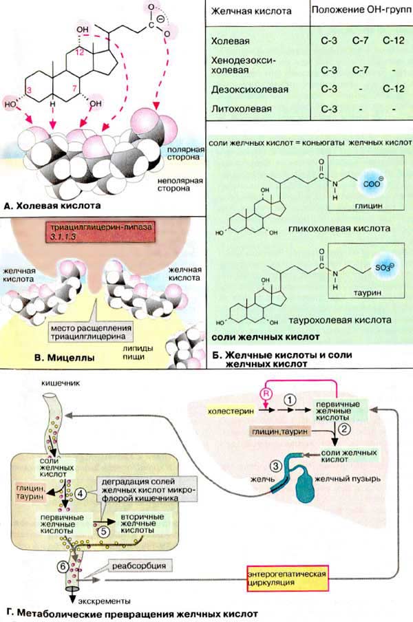 В связи с наличием в структуре α-гидроксильных групп желчные кислоты и соли желчных кислот являются амфифильными соединениями и обладают свойствами детергентов. Основные функции желчных кислот состоят в образовании мицелл, эмульгировании жиров и солюбилизации липидов в кишечнике. Это повышает эффективность действия панкреатической липазы и способствует всасыванию липидов.