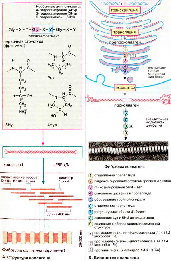Предшественник коллагена (препропептид) синтезируется на рибосомах на поверхности гранул ШЭР. Прежде чем превратиться в зрелую форму белок-предшественник подвергается значительной посттрансляционной модификации в эндоплазматическом ретикулуме и аппарате Гольджи. Отщепление сигнального пептида (1) приводит к образованию проколлагена. Молекула проколлагена все еще несет на одном конце длинный пропептид. Далее следует гидроксилирование многих остатков пролина и ряда остатков лизина (2). Некоторые остатки гидроксилизина дополнительно гликозилируются (3). Окисление остатков цистеина приводит к образованию внутри- и межмолекулярных дисульфидных связей (4), которые обеспечивают правильное скручивание полипептидных цепей в тройную спираль (5). Прежде чем секретироваться в межклеточное пространство, молекула проколлагена должна пройти стадии модификации и правильной сборки. В процессе транспорта через плазматическую мембрану отщепляются N- и С-концевые пропептиды (6). Коллаген выходит из клетки и в результате ступенчатой сборки образует микрофибриллы (7). Наконец, ε-аминогруппы некоторых остатков лизина подвергаются ферментативному окислению с образованием альдегидных групп (8). Последний этап — конденсация (9) с образованием внутри- и межмолекулярных поперечных связей, в результате чего фибриллы коллагена приобретают окончательную структуру, характеризующуюся прочностью на разрыв и высокой устойчивостъю к действию протеиназ.