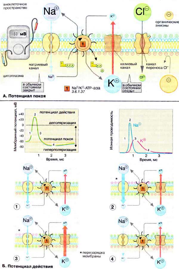 Возбуждение нервной клетки под действием химического сигнала (реже электрического импульса) приводит к возникновению потенциала действия. Это означает, что потенциал покоя -60 мВ скачком изменяется на +30 мВ и спустя 1 мс принимает исходное значение. Процесс начинается с открывания Nа+-канала (1). Ионы Na+ устремляются в клетку (по градиенту концентрации), что вызывает локальное обращение знака мембранного потенциала (2). При этом Na+-каналы тотчас закрываются, т. е. поток ионов Na+ в клетку длится очень короткое время (3). В связи с изменением мембранного потенциала открываются (на несколько мс) потенциал-управляемые К+-каналы (2) и ионы К+ устремляются в обратном направлении, из клетки. В результате мембранный потенциал принимает первоначальное значение (3), и даже превышает на короткое время потенциал покоя (4). После этого нервная клетка вновь становится возбудимой.