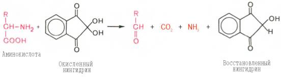 Для открытия в биообъектах и количественного определения аминокислот успешно применяется реакция их с нингидрином. На I стадии реакции образуется восстановленный нингидрин за счет окислительного дезаминирования аминокислот (параллельно происходит декарбоксилирование аминокислот):