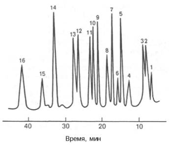 Рис. 1.8. ВЭЖХ аминокислот по Цеху и Вольтеру. Разделение на колонке (3 х 250 мм), наполненной ионообменной смолой – полистиролдивинилбензолом. Концентрация аминокислот 500 пмоль/л, реактив для детектирования – флюорескамин, образующий с аминогруппой сильно флюоресцирующее соединение.