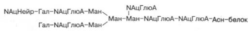 Структура одного из нескольких гетероолигосахаридных остатков в молекуле гликопротеинов, в частности иммуноглобулинов, может быть представлена в виде следующей схемы (использованы сокращения: Глю – глюкоза, NАцГлюА – N-ацетилглюкозамин; Гал – галактоза; Ман – манно-за; NАцНейр – N-ацетилнейраминовая кислота):