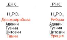 В молекуле ДНК углевод представлен дезоксирибозой, а в молекуле РНК – рибозой, отсюда их названия: дезоксирибонуклеиновая (ДНК) и рибонуклеиновая (РНК) кислоты. Кроме того, они содержат фосфорную кислоту, по два пуриновых и по два пиримидиновых основания; различия только в пиримидиновых основаниях: в ДНК содержится тимин, а в РНК – урацил. В составе ДНК и РНК открыты так называемые минорные (экзотические) азотистые основания (строение некоторых из них приводится далее).