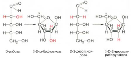 Углеводы (рибоза и дезоксирибоза) в молекулах ДНК и РНК находятся в β-D-рибофуранозной форме: