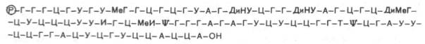 В этой структуре Р – остаток фосфата, ψ – псевдоУМФ, МеГ – метилгуа-нин, ДиНУ – дигидроурацил, ДиМеГ – диметилгуанин, МеИ – метилинозин.