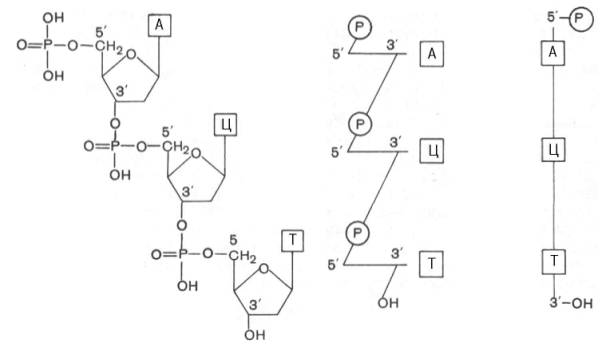 Результаты секвенирования (определение нуклеотидной последовательности) разных молекул ДНК накапливаются в виде компьютерных банков данных, которые уже доступны для пользователей международных компьютерных сетей (например, «Internet»). Ниже представлены три варианта схемы нуклеотидной последовательности ДНК: