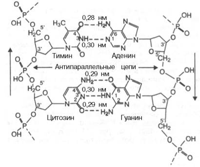 Детальный анализ всевозможных вариантов образования водородных связей между основаниями показал, что в биспиральной молекуле ДНК основания уложены парами: пурин из одной цепи и пиримидин из другой в соответствии с правилами Чаргаффа. Поскольку ориентация оснований на плоскости не является, очевидно, произвольной, и основания в поли-нуклеотидах представлены в лактамной форме, наиболее вероятными были признаны пары аденин–тимин и гуанин–цитозин. Этот способ спаривания получил в дальнейшем экспериментальное подтверждение. Избирательность взаимодействия пар А–Т и Г–Ц принято выражать термином «комплементарность», а соответствующие азотистые основания называют комплементарными. Стабильность А–Т оснований обеспечивается двумя водородными связями, а пар Г–Ц – тремя, что в свою очередь определяется особенностями расположения функциональных групп азотистых оснований. Длина водородных связей между основаниями составляет около 0,3 нм. Таким образом, комплементарными оказываются не только отдельные основания, но и дезоксирибонуклеотидные цепи ДНК в целом, способствующие образованию весьма компактной структуры и стабилизации всей молекулы.