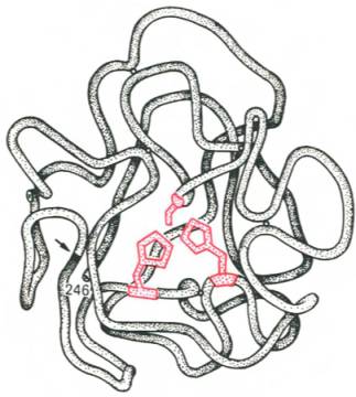 Рис. 4.3. Гипотетическая модель третичной структуры молекулы предшественника химотрипсина (по Ней-рату). Цветом выделены остатки серина и гисти-дина; стрелкой обозначено место отщепления N-концевого участка полипептидной цепи.