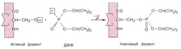 При помощи методов ингибиторного анализа были предприняты попытки установить закономерности состава и структуры активных центров у ферментов, относящихся к разным группам. В частности, при использовании диизопропилфторфосфата (ДФФ), принадлежащего к так называемым нервным ядам, наблюдается полное выключение активного центра холинэстеразы – фермента, катализирующего гидролиз ацетилхолина на холин и уксусную кислоту. Оказалось, что этот ингибитор имеет близкое структурное сходство с ацетилхолином и подобно ему взаимодействует с ОН-группой остатка серина в активном центре. Вызывая фосфорилирование серина в активном центре ряда других ферментов, ДФФ также инактивирует их действие: