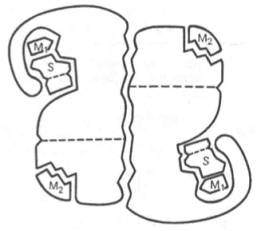Рис. 4.4. Схематическое изображение аллостерического фермента, состоящего из двух протомеров, соединенных по типу гетерологи-ческой («голова»-«хвост») ассоциации (по Кошленду). S – субстрат; М1 – модификатор, связывающийся в активном центре; М2 – модификатор, связывающийся в аллосте-рическом центре (эффектор).