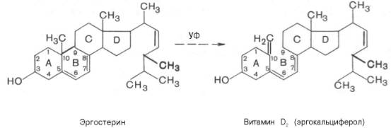 Витамин D2образуется из эргостерина в результате разрыва связи между 9-м и 10-м углеродными атомами кольца В под действием УФ-лучей.