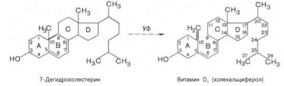Следует отметить, что благодаря наличию холестерина и 7-дегидро-холестерина в составе липидов кожи человека возможен синтез витамина D3при солнечном облучении или облучении лампой ультрафиолетового излучения поверхности тела. Этим приемом особенно широко пользуются при лечении рахита у детей.