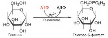 Первой ферментативной реакцией гликолиза является фосфорилирование, т.е. перенос остатка ортофосфата на глюкозу за счет АТФ. Реакция катализируется ферментом гексокиназой: