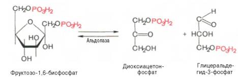 Четвертую реакцию гликолиза катализирует фермент альдолаза. Под влиянием этого фермента фруктозо-1,6-бисфосфат расщепляется на две фосфотриозы: