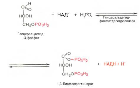 1,3-Бисфосфоглицерат представляет собой высокоэнергетическое соединение (макроэргическая связь условно обозначена знаком «тильда» ~). Механизм действия глицеральдегидфосфатдегидрогеназы сводится к следующему: в присутствии неорганического фосфата НАД+ выступает как акцептор водорода, отщепляющегося от глицеральдегид-3-фосфата. В процессе образования НАДН глицеральдегид-3-фосфат связывается с молекулой фермента за счет SH-групп последнего. Образовавшаяся связь богата энергией, но она непрочная и расщепляется под влиянием неорганического фосфата, при этом образуется 1,3-бисфосфоглицериновая кислота.