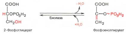 Девятая реакция катализируется ферментом енолазой, при этом 2-фосфоглицериновая кислота в результате отщепления молекулы воды переходит в фосфоенолпировиноградную кислоту (фосфоенолпируват), а фосфатная связь в положении 2 становится высокоэргической:
