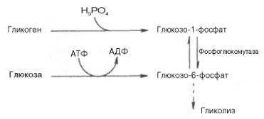 Как отмечалось, процесс анаэробного распада гликогена получил название гликогенолиза. Вовлечение D-глюкозных единиц гликогена в процесс гликолиза происходит при участии 2 ферментов – фосфорилазы а и фосфо-глюкомутазы. Образовавшийся в результате фосфоглюкомутазной реакции глюкозо-6-фосфат может включаться в процесс гликолиза. После образования глюкозо-6-фосфата дальнейшие пути гликолиза и гликогенолиза полностью совпадают: