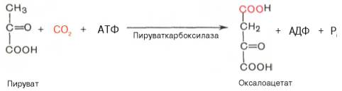 Образование фосфоенолпирувата из пирувата. Синтез фосфоенолпирувата осуществляется в несколько этапов. Первоначально пируват под влиянием пируваткарбоксилазы и при участии СО2 и АТФ карбоксилируется с образованием оксалоацетата: