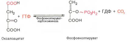 Затем оксалоацетат в результате декарбоксилирования и фосфорилирования под влиянием фермента фосфоенолпируваткарбоксилазы превращается в фосфоенолпируват. Донором фосфатного остатка в реакции служит гуанозинтрифосфат (ГТФ):