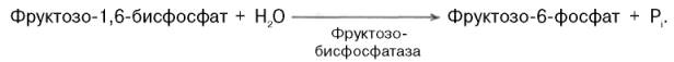 Превращение фруктозо-1,6-бисфосфата во фруктозо-6-фосфат. Фосфо-енолпируват, образовавшийся из пирувата, в результате ряда обратимых реакций гликолиза превращается во фруктозо-1,6-бисфосфат. Далее следует фосфофруктокиназная реакция, которая необратима. Глюконеогенез идет в обход этой эндергонической реакции. Превращение фруктозо-1,6-бис-фосфата во фруктозо-6-фосфат катализируется специфической фосфатазой:
