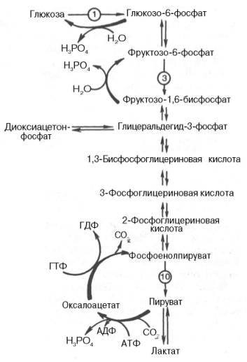 Рис. 10.7. Гликолиз и глюконеогенез. Красными стрелками указаны «обходные» пути глюконеогенеза при биосинтезе глюкозы из пирувата и лактата; цифры в кружках обозначают соответствующую стадию гликолиза.