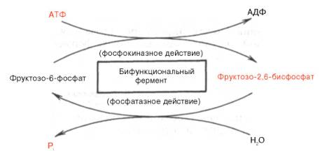 Установлено, что биосинтез фруктозо-2,6-бисфосфата происходит из фруктозо-6-фосфата при участии АТФ, а распадается он на фруктозо-6-фосфат и неорганический фосфат. Биосинтез и распад фруктозо-2,6-бис-фосфата катализируется одним и тем же ферментом, т.е. данный фермент бифункционален, он обладает и фосфокиназной, и фосфатазной активностью: