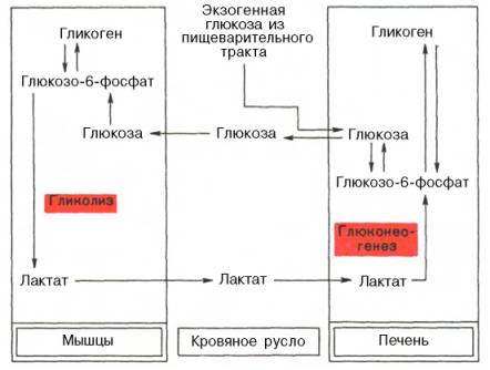 Наконец, интересно отметить, что между гликолизом, интенсивно протекающим в мышечной ткани при ее активной деятельности, и глюко-неогенезом, особенно характерным для печеночной ткани, существует тесная взаимосвязь. При максимальной активности мышц в результате усиления гликолиза образуется избыток молочной кислоты, диффундирующей в кровь, в печени значительная ее часть превращается в глюкозу (глюконеогенез). Такая глюкоза затем может быть использована как энергетический субстрат, необходимый для деятельности мышечной ткани. Взаимосвязь между процессами гликолиза в мышечной ткани и глюконеогенезом в печени может быть представлена в виде схемы: