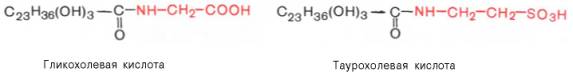 Как отмечалось, желчные кислоты присутствуют в желчи в конъюги-рованной форме, т.е. в виде гликохолевой, гликодезоксихолевой, гли-кохенодезоксихолевой (около 2/3 – 4/5 всех желчных кислот) или таурохо-левой, тауродезоксихолевой и таурохенодезоксихолевой (около 1/5 – 1/3 всех желчных кислот) кислот. Эти соединения иногда называют парными желчными кислотами, так как они состоят из двух компонентов – желчной кислоты и глицина или таурина. Соотношения между конъюгатами обоих видов могут меняться в зависимости от характера пищи: в случае преобладания в ней углеводов увеличивается относительное содержание глициновых конъюгатов, а при высокобелковой диете – тауриновых конъюгатов. Строение парных желчных кислот может быть представлено в следующем виде: