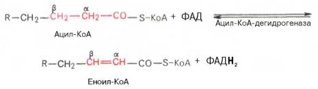 Первая стадия дегидрирования. Ацил-КоА в митохондриях прежде всего подвергается ферментативному дегидрированию, при этом ацил-КоА теряет 2 атома водорода в α- и β-положениях, превращаясь в КоА-эфир ненасыщенной кислоты. Таким образом, первой реакцией в каждом цикле распада ацил-КоА является его окисление ацил-КоА-де-гидрогеназой, приводящее к образованию еноил-КоА с двойной связью между С-2 и С-3: