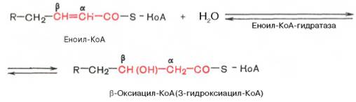 Стадия гидратации. Ненасыщенный ацил-КоА (еноил-КоА) при участии фермента еноил-КоА-гидратазы присоединяет молекулу воды. В результате образуется β-оксиацил-КоА (или 3-гидроксиацил-КоА):
