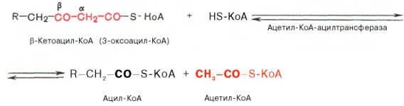 Тиолазная реакция. В ходе предыдущих реакций происходило окисление метиленовой группы при С-3 в оксогруппу. Тиолазная реакция представляет собой расщепление 3-оксоацил-КоА с помощью тиоловой группы второй молекулы КоА. В результате образуется укороченный на два углеродных атома ацил-КоА и двууглеродный фрагмент в виде ацетил-КоА. Данная реакция катализируется ацетил-КоА-ацилтрансферазой (β-ке-тотиолазой):