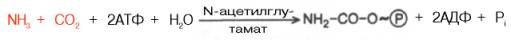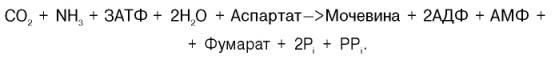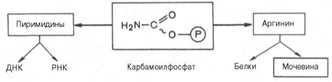 Таким образом, весь цикл мочевинообразования может быть представлен следующим образом. На первом этапе синтезируется макроэргическое соединение карбамоилфосфат – метаболически активная форма аммиака, используемая в качестве исходного продукта для синтеза пиримидиновых нуклеотидов (соответственно ДНК и РНК) и аргинина (соответственно белка и мочевины):