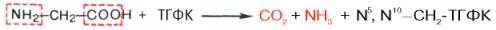 Механизм этой реакции, недавно раскрытый К. Тада, включает участие митохондриальной глицинрасщепляющей ферментной системы, отличной от глицинсинтазы и состоящей из 4 белков: Р-белка, содержащего пиридоксальфосфат (глициндекарбоксилаза); Н-белка, содержащего липое-вую кислоту; Т-белка, требующего присутствия ТГФК, и L-белка, названного липамиддегидрогеназой: