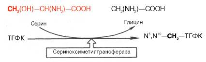 Регенерация N5,N10–СН2–ТГФК, собственно ее биосинтез, представляет определенный интерес. Оказалось, что этот синтез требует участия аминокислоты серина (донатор метильной группы) и пиридоксальфосфат-содержащего фермента сериноксиметилтрансферазы в соответствии с уравнением: