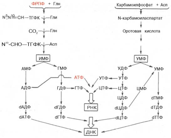 Далее на двух схемах суммированы данные о взаимопревращениях пуриновых и пиримидиновых нуклеотидов, а также о связи их с синтезом нуклеиновых кислот. Как видно из схем, в образовании пуриновых и пиримидиновых нуклеотидов специфическое участие принимает ФРПФ, являющийся донором фосфорибозильного остатка в биосинтезе как оро-тидин-5'-фосфата, так и ИМФ; последние считаются ключевыми субстратами в синтезе нуклеиновых кислот в клетках.