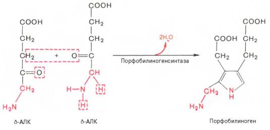 Фермент, катализирующий эту стадию,– порфобилиногенсинтаза также является регуляторным ферментом, подвергаясь ингибированию конечными продуктами синтеза. Предполагают, что механизм этой сложной реакции дегидратации включает образование кетиминной связи (шиффово основание) между кетогруппой одной молекулы δ-аминолевулиновой кислоты и δ-аминогруппой лизина молекулы фермента. В следующей многоступенчатой стадии, катализируемой соответствующими ферментами, из 4 монопиррольных молекул порфобилиногена синтезируется тетра-пиррольный комплекс протопорфирин IX, являющийся непосредственным предшественником гема. Некоторые этапы сложного пути синтеза окончательно не установлены.